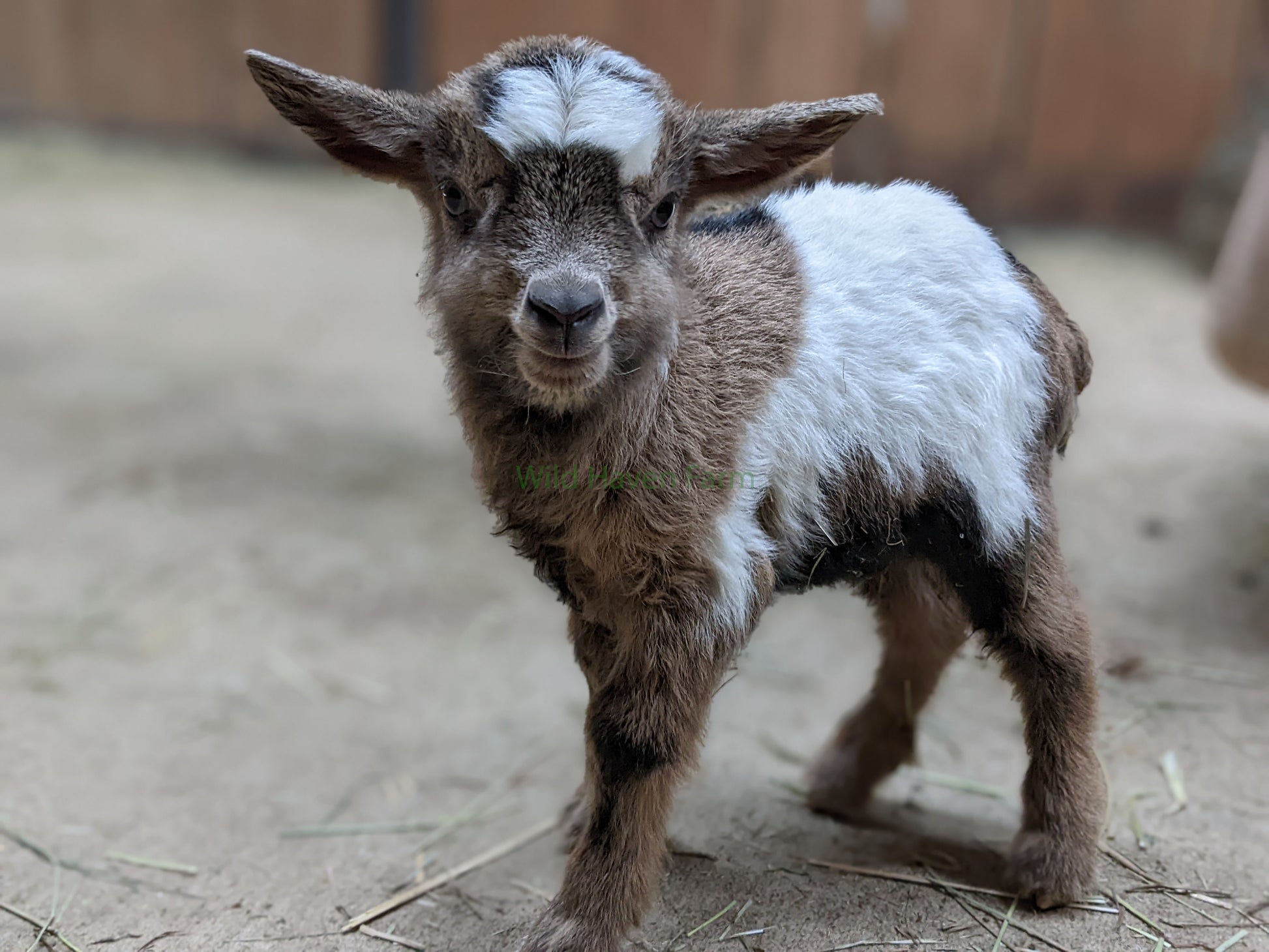 Wild Haven Walt is a yearling myotonic (fainting goat) buck born in February 2022 from Cowboy and Gloria. Walt is a sweet and cuddly goat who loves pets and being near people. He faints readily and frequently drags his hind legs when startled and will fall completely. With a strong myotonia, he is less playful than some bucks but socializes very well. His coat is soft and full and he has matured into a true miniature silky fainter.